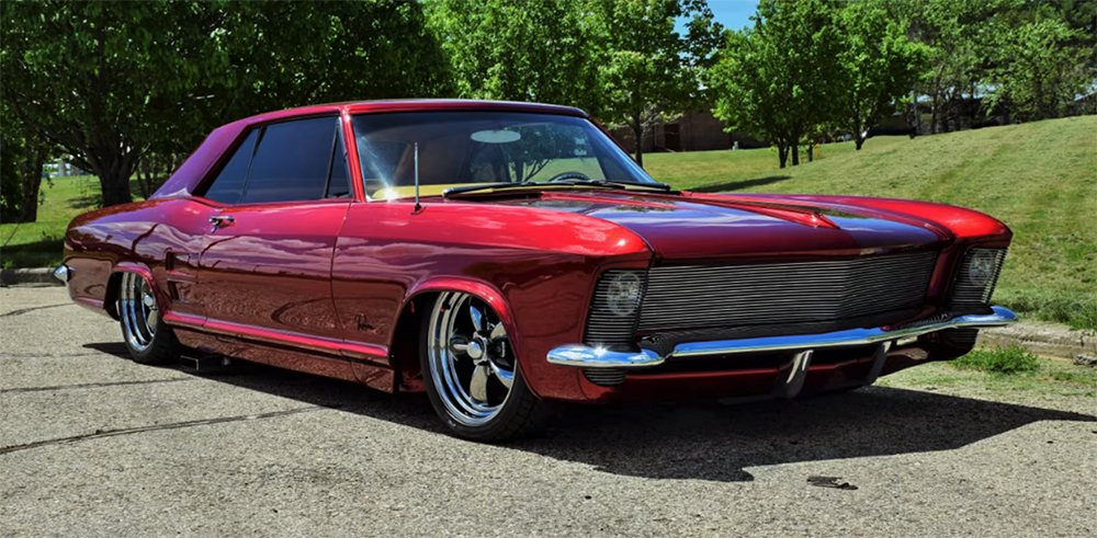 Above and below: 1963 Buick Riviera lowered with custom wheels and a full-on custom laying frame but still retaining its original 425 cubic inch Nailhead V8 (photos courtesy of Mecum Auctions)